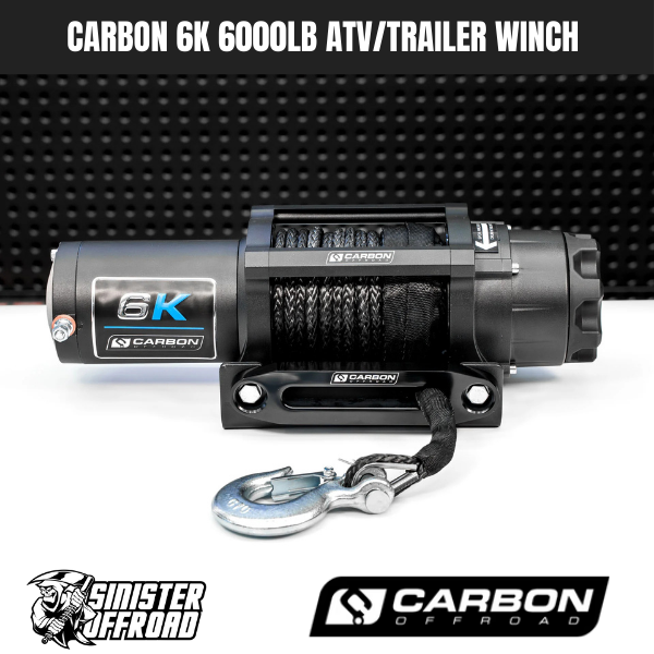 Carbon Offroad 6,000 lb ATV Winch – Compact, versatile winch for ATVs, small 4WDs, trailers, caravans, and boats. Features sealed motor & geartrain, permanent magnet motor, dual wired & wireless remotes, and fail-safe braking.