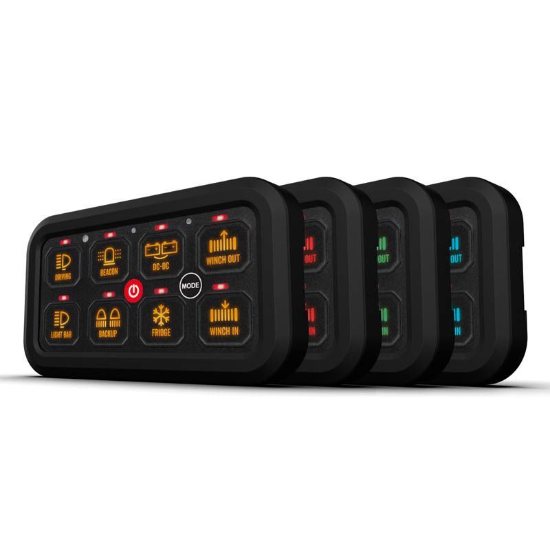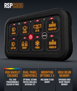 The Roadpower in-car auxiliary switch panel provides a userfriendly interface to control up to 8 switchable components including auxiliary lighting, winch systems and battery setups. With soft backlit buttons that support on/off, momentary or pulsating functions and a simple DIY installation, the Roadpower RSP8300 is versatile and customisable with 70 included switch decals to suit most applications.